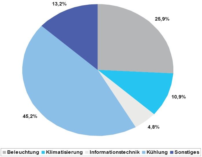 Im Food-Bereich stellt die Kühlung mit 45,2 Prozent den größten Stromverbraucher dar, gefolgt von der Beleuchtung mit 25,9 Prozent und der Klimatisierung mit einem Anteil von 10,9 Prozent (Bild 2). Wie auch im Nonfood-Handel nimmt die Informationstechnik mit 4,8 Prozent des Stromverbrauchs eine eher untergeordnete Rolle ein. Unter Sonstiges sind Türen, Kassensysteme, Waagen, Produktion, Konzessionäre und sonstige Kleinstgeräte zusammengefasst.