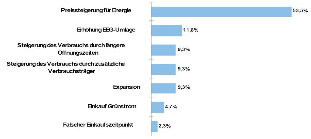 Wesentlicher Grund für die Steigerung der Energiekosten sind aus Sicht der Mehrheit der Befragten zweifelsohne die Preiserhöhungen für Energie. Die weiteren Gründe für diese Entwicklung sind (Bild 1):