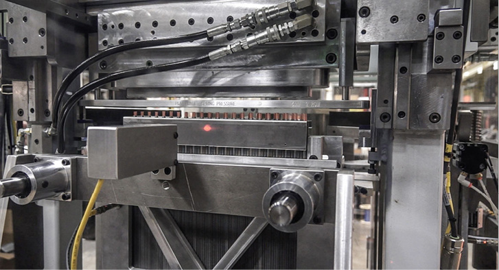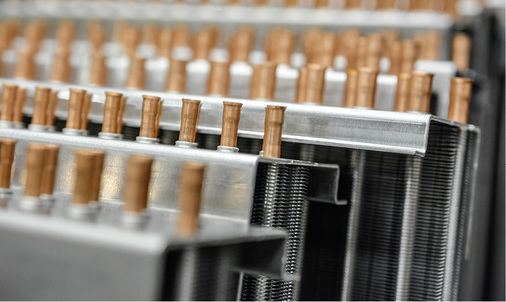 Alle oben genannten Schritte sind voneinander unabhängig, und mit der speziellen Ausrüstung ist ein Zwischenprodukt für den nächsten Schritt in der Fertigungslinie möglich. Jeder Schritt hat sich entwickelt und wurde in hohem Maße weiter verfeinert. Beim Stanzen der Lamellen werden beispielsweise hochentwickelte Lamellenmaschinen verwendet, die eng platzierte Lochmuster und optimierte Kragenhöhen erlauben. Die Pressen verfügen im Stanzprozess über eine Presskraft von 160 Tonnen bei hohen Durchlaufgeschwindigkeiten und geringem Standflächenbedarf. Pressen mit hoher Presskraft ermöglichen die Verwendung von dickeren Lamellen und Lamellenmaterial mit höherer Zugfestigkeit. Die Entwicklung der Lamellenform und das nachfolgende Stanzen sind Schlüsselelemente für die wettbewerbsfähige Produktion von Wärmeübertragern [11, 12, 13]. Weitere Fortschritte beinhalten die Entwicklung verschiedener Methoden der Rohraufweitung, die im Folgenden beschrieben wird.
