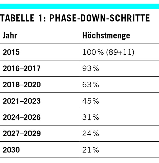 Der regulatorische Hintergrund ist die F-Gase-Verordnung von 2014, in der beginnend im Jahr 2015 eine Begrenzung und stufenweise Reduzierung der HFKW-Vermarktungsmengen in der EU durch eine Quotenregelung festgelegt ist (Tabelle 1).