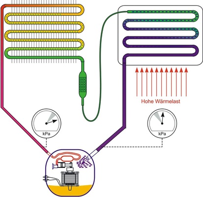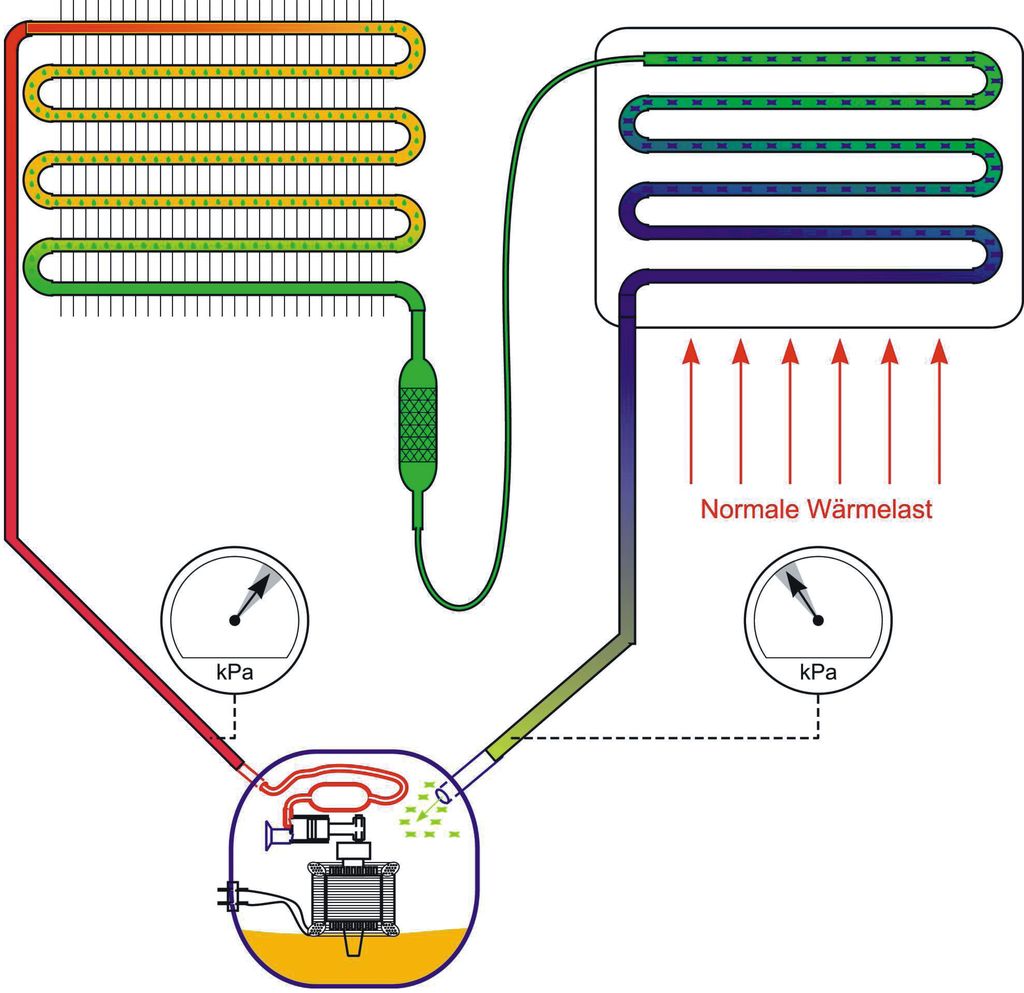 Bild 2 zeigt, wie unter normalen, also durch den Konstrukteur bestimmten Bedingungen, weite Bereiche des Verdampfers für den Verdampfungsprozess genutzt werden. Er ist zu einem hohen Prozentsatz mit Flüssigkeit beaufschlagt, welche letztlich vollständig verdampft als überhitzter Saugdampf in den Verdichter eintritt. Die grauen Flächen der Manometer symbolisieren die Bereiche unter diesen Normbedingungen.