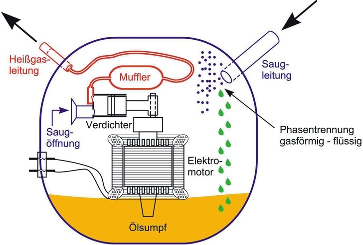 Grund: Die Saugleitung mündet offen in die Verdichterkapsel ein, so dass gegebenenfalls zurückkommendes unverdampftes Kältemittel durch die Schwerkraft im Ölsumpf landet. Da das eigentliche Ansaugen in den Zylinder im oberen Drittel der Kapsel erfolgt, wird also zurückkommende Flüssigkeit zunächst im Ölsumpf durch Aufnahme von Motorwärme verdampfen, bevor sie dann, in die gasförmige Phase überführt, dem Verdichtungsprozess zugeführt wird.