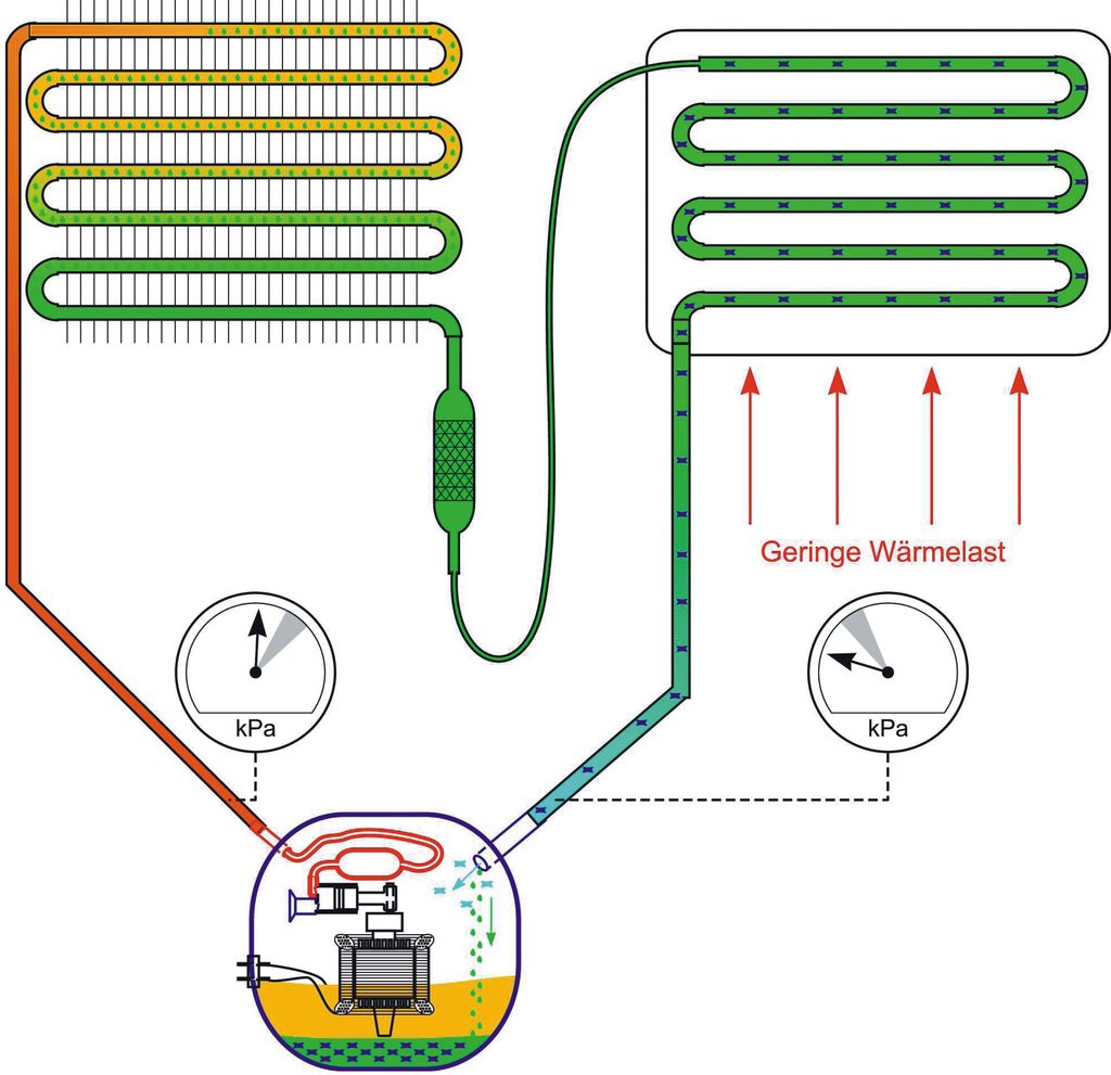 Bei geringer Wärmelast, beispielsweise wenn ein Haushaltskühlschrank bei niedriger Temperatur nur wenig mit Wärmeeinfall belastet ist, kann die eingespritzte Flüssigkeit im Verdampfer nur unvollständig verdampfen. Bild 4 veranschaulicht nun, wie flüssiges Kältemittel in der Verdichterkapsel vorwiegend im Ölsumpf unter Wärmeaufnahme verdampft. In der Praxis mischt sich das Kältemittel hierbei mit dem Öl, welches verdünnt wird und durch die Dampfbildung stark schäumt, ein Effekt, der dem Praktiker von größeren Verdichtern mit Schauglas im Ölsumpf bekannt ist, beispielsweise wenn bei Anlagen mit thermostatischen Überhitzungsreglern (TEV) die Sauggasüberhitzung fehlerhaft klein ist. Dieser Betriebszustand ist für die Schmierung des Verdichters nachteilig, wird aber praktisch durch den Thermostaten weitgehend verhindert, der ja bei Erreichen der Solltemperatur den Verdichter abschaltet.