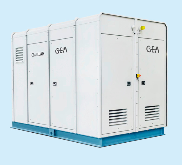 Gea bietet mit der Baureihe BluAir einen Flüssigkeitskühlsatz für mittlere und große Kälteanwendungen in Industrie und Klimatisierung. Die Anlage arbeitet mit dem Kältemittel Ammoniak (R 717) und ist mit Schraubenverdichtern der Baureihe Grasso M ausgestattet. Der Kälteleistungsbereich erstreckt sich je nach Baugröße von 370 kW bis 1270 kW, bezogen auf Kaltwasser von 12 °C auf 6 °C und eine Lufteintrittstemperatur von 35 °C. Das System arbeitet mit überfluteter Verdampfung in einem vollverschweißten Plattenwärmeübertrager mit integriertem Abscheider. Die Verflüssigung erfolgt über einen luftgekühlten Verflüssiger mit drehzahlgeregelten EC-Ventilatoren. Die modulare Bauweise fasst die Komponenten in einem demontierbaren Wetterschutzgehäuse für die Außenaufstellung zusammen, das mit Belüftung, Heizung, Beleuchtung und einer Ammoniak-Warnanlage ausgestattet ist. Die Anlage wird anschlussfertig, komplett verrohrt und verdrahtet geliefert. Die Steuerung erfolgt über das System Omni mit Touchpanel, das eine bedarfsgerechte Leistungsregelung über einen Frequenzumformer ermöglicht und alle Betriebs- und Prozessvariablen anzeigt. Optional ist eine Remote-Ausführung für den Anschluss an einen bauseitigen Verflüssiger erhältlich.