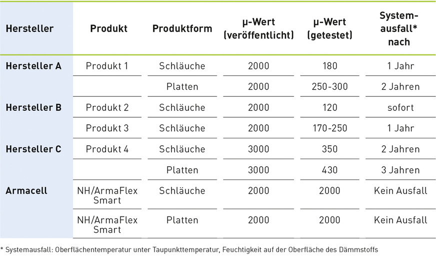 Ein geringer Wasserdampfdiffusionswiderstand erhöht das Risiko einer Durchfeuchtung des Dämmstoffs. Bereits ein Feuchtigkeitseintritt von nur 4 Prozent (bezogen auf das Volumen) reichen aus, um die Wirksamkeit der Dämmung um bis zu 70 Prozent zu verringern. Bei Dämmstoffen mit einem Wasserdampfdiffusionswiderstand von 400 sinkt die Oberflächentemperatur schon nach einer Betriebszeit von nur drei Jahren unter die Taupunkttemperatur. Tauwasser fällt auf der Oberfläche aus und das Dämmsystem versagt. Bei Dämmstoffen mit einem µ-Wert von 120 fällt das System bereits im ersten Betriebsjahr aus. Die Kalkulationen wurde mit folgenden Parametern durchgeführt: φ = 70 %, θa = 20 °C, θi = 6 °C, 19 mm Dämmschichtdicke, Rohrdimension DN 80.