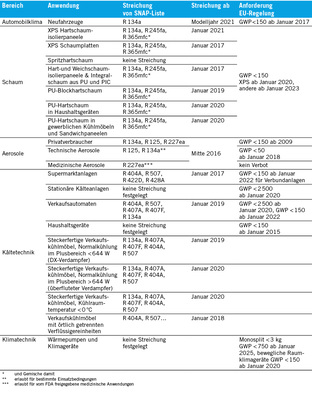 Gegenüber dem ersten Entwurf wurde die SNAP-Regelung im Rahmen des Konsultationsverfahrens in einigen Bereichen geändert, besonders im Bereich Schäume und Gewerbekälte. Tabelle 1 ist hier nicht als umfassende Darstellung gedacht, sondern vergleicht exemplarisch die Verwendungsbeschränkungen in Europa und in den USA für die wesentlichen HFKW in verschiedenen Anwendungen. Es wurde versucht, die Maßnahmen für die einzelnen Anwendungsgebiete so übersichtlich und umfassend wie möglich darzustellen, in einigen Fällen ist jedoch eine direkte Vergleichbarkeit nicht gegeben. Eine vollständige Liste der von der SNAP-Regelung betroffenen HFKW und der anwendungsbezogenen Ausnahmen ist auf der Website der US-EPA erhältlich.