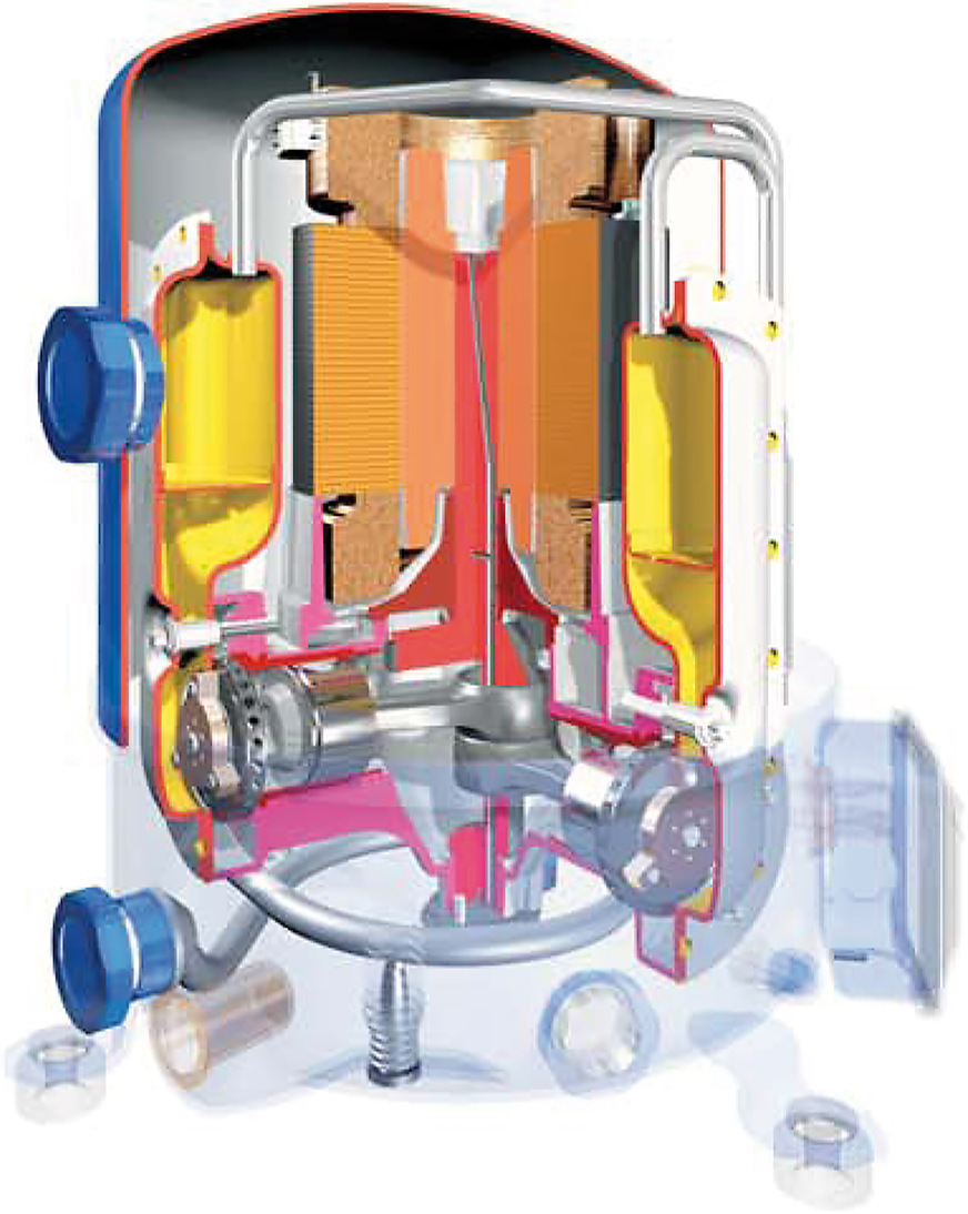 Eine weitere Maßnahme, die zu mehr Zuverlässigkeit und Langlebigkeit führt, ist das große interne Volumen auf der Saugseite. MTZ-Verdichter haben ein großes freies Volumen und bieten einen gewissen Schutz gegen Flüssigkeitsschlägen, sollte tatsächlich einmal etwas flüssiges Kältemittel in den Verdichter gelangen. Natürlich ist das normalerweise nicht der Fall, da bei einer ausreichenden Überhitzung das ganze Kältemittel am Saugstutzen des Verdichters bereits verdampft ist. Dies sollte eigentlich schon am Ausgang des Verdampfers der Fall sein (aktive Überhitzung) und in der Folge bis zum Saugstutzen (passive Überhitzung) dann ganz sicher. Ist dies dennoch nicht geschehen, dann kann auch eine kleine Menge des flüssigen Kältemittels im Inneren des Verdichters verdampfen. Trotzdem muss jedem klar sein, dass ein Verdichter keine Flüssigkeit verdichten kann, sei es flüssiges Kältemittel, oder exzessive Mengen an „Öl“ (Polyolester oder Polyvinylether).