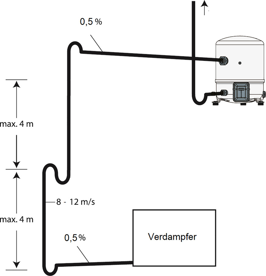 Bei einem vollhermetischen MTZ-Verdichter liegt dies auch daran, dass die interne Druckleitung im Verdichtersumpf in einer Rohrschleife geführt wird und damit das Öl bei Temperatur hält. Sollte das Schauglas aber bei einer Wartung tatsächlich anzeigen, dass zu wenig Öl im Verdichter ist, so gibt es mehrere Punkte, die zu prüfen sind. Bei einem weitläufigen System kann es ausreichen, einfach Öl nachzufüllen. Zu prüfen ist auch, ob die Saugleitung in regelmäßigen Abständen über Ölhebebögen verfügt, falls der Verdichter auf dem Dach montiert ist bzw. die Saugleitung beträchtliche Höhenmeter als Steigleitung überwinden muss.