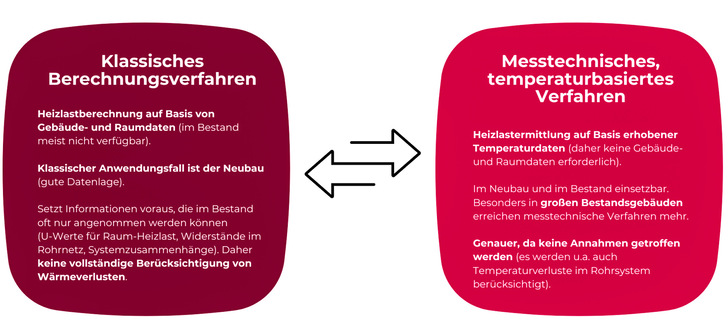Diese Methode eignet sich gut für Neubauten und kleinere Gebäude mit klarer Hydraulikstruktur und vollständiger Datenlage. In großen, gewachsenen Bestandsgebäuden oder bei unvollständigen Dokumentationen stößt das Verfahren jedoch schnell an seine Grenzen. Denn selbst kleinste Abweichungen in der Annahme – etwa bei der tatsächlichen Nutzung eines Raumes – können zu spürbaren Komfortverlusten und Energieverschwendung führen. Zudem bleibt das Ergebnis meist unbeobachtet: Eine messtechnische Kontrolle der errechneten Werte findet in der Praxis nicht statt.