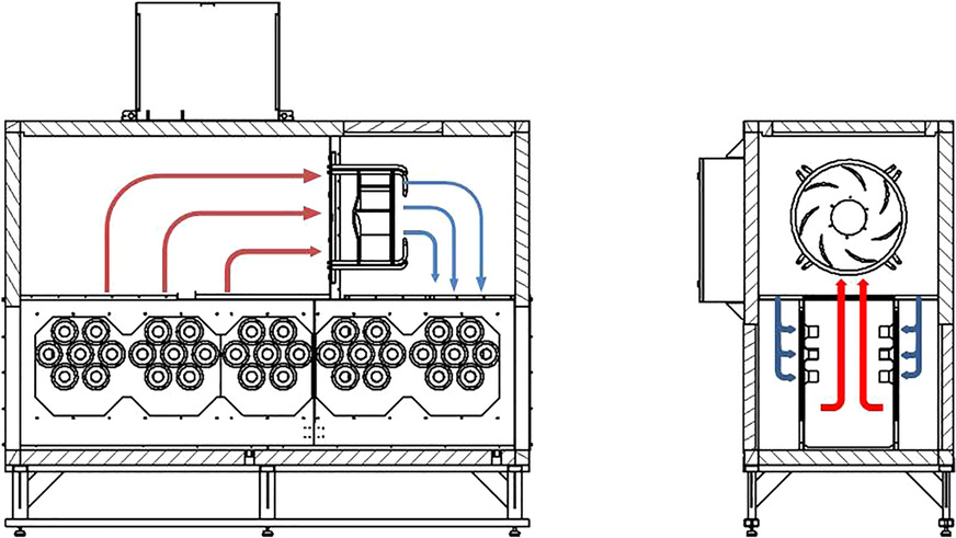 Aus diesem besagten Grund ist der Einsatz von Kühlwasser oder ein aktives Kühlkonzept erforderlich, welches luft- oder wassergekühlt ausgeführt werden kann. Bei dem Einsatz von Kühlwasser oder auch Betriebswasser genannt, werden die Luft und die Bauteile in dem Kühltunnel über einen Luft-Wasser-Wärmeübertrager abgekühlt und bieten somit einen guten und einfachen Wärmeabtransport der eingebrachten Energie.