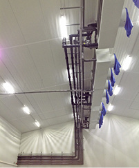 Um sowohl in den Sommer- als auch in den Wintermonaten die Kühlung der Lagerräume zu gewährleisten, wurde eine spezielle Kälteanlage mit jeweils zwei Kreisläufen mit dem Kältemittel Propan und einem Solesystem erstellt. Beide Kältemittelkreisläufe sind identisch und außerhalb des Gebäudes aufgebaut. Zu beachten war jedoch, dass aufgrund der hochentzündlichen und explosionsgefährlichen Eigenschaften von Propan, ausschließlich Komponenten der Fluidgruppe 1eingesetzt werden. Die Kältemittel-Füllmenge beträgt 49 kg R 290 pro Kreislauf.