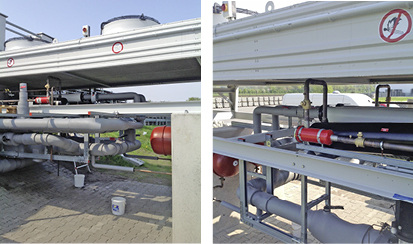 Da die Umgebungstemperatur bzw. die Verflüssigungstemperatur im Winter geringer ist, dienen drei eingebaute Heizstäbe im Notfall mit einer Leistung von insgesamt 18 kW der Erwärmung der Sole im Vorratsspeicher. Die Heizstäbe werden entsprechend der erforderlichen Heizleistung stufenweise zugeschaltet. Die Anlage ist so eingestellt, dass je nach Bedarf, hier einmal täglich in der Nacht, der Kaltsolekreislauf abgesperrt wird und dann die warme Sole über eine Sole-Umwälzpumpe in den Vorlauf der Kaltsoleleitungen der Verdampfer der Kühlräume 1 und 2 eingespeist wird. Die warme Sole taut die Eisschicht an den Verdampferlamellen ab. Auch die Tropfwasserwannen der Verdampfer werden über Bypassleitungen abgetaut. Anschließend wird die Sole zurück in den Warmsole-Vorratsspeicher geleitet.