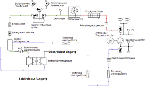 Eine Bereifung bzw. Eisbildung hat wiederum Leistungseinbußen zur Folge. Aus diesem Grund ist eine Abtaueinrichtung erforderlich, die hier über einen 10 000-Liter-Warmsole-Vorratsspeicher realisiert wird. Die Enthitzungswärme des Verdichtungsprozesses wird in den Warmsole-Vorratsspeicher geführt. Das Kältemittel strömt mit einer Druckgastemperatur von ca. +50 °C in den Enthitzer. Gleichzeitig strömt die hergeführte Sole mit einer Vorlauftemperatur von 20 °C durch den Enthitzer. Die Sole nimmt diese Wärmeenergie auf und kann so mit einer Rücklauftemperatur von etwa 30 °C den Warmsole-Vorratsspeicher erhitzen. Ebenso wie beim Plattenwärmeübertrager findet eine Wärmeübertragung statt. Das Kältemittel wird enthitzt und verlässt den Enthitzer mit einer Temperatur von +15 °C. Dieses gibt dann im Verflüssiger weitere Wärmeenergie an die Umgebung ab, bis es schließlich in flüssiger Form vorliegt.