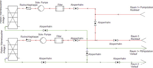 Die Pumpenstation ist im Wesentlichen ein einfaches Rohrleitungssystem, in dem über Pumpen und Bypass-Leitungen sowie über Drei-Wege-Ventile die Temperaturen angepasst und die Kreisläufe in den Räumen 2 und 3 geregelt werden. Insgesamt befinden sich 20 000 l Soleflüssigkeit in der Anlage.