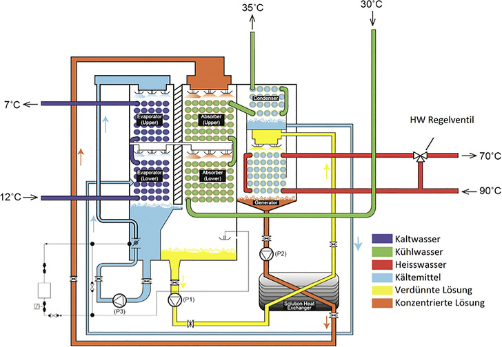 Neben diesen Double Effect Absorbern, die mit einer Antriebstemperatur von VL = 90 °C und RL = 70 °C – was einer klassischen BHKW-Anwendung entspricht – eine Austrittstemperatur von − 5 °C erreichen können, bietet Johnson Controls den Single Lift Double Effect Absorber, der ideal auch mit einer Antriebstemperatur von 55 °C auskommt und sich dadurch für den Einsatz in Fernwärmenetzen oder Stadtwerken eignet. Denn Fernwärmenetze möchten in den Sommermonaten eine Temperatur unter 60 °C fahren. Vor der Entwicklung des Single Lift Double Effect Absorbers ließ sich das mit Absorptionskälteanlagen nicht realisieren, denn sie bedurften mindestens einer Antriebstemperatur von über 80 °C.