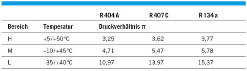 Die unterschiedlichen Drucklagen einiger Kältemittel bei den Anwendungsbereichen H, M und L sollen das verdeutlichen.