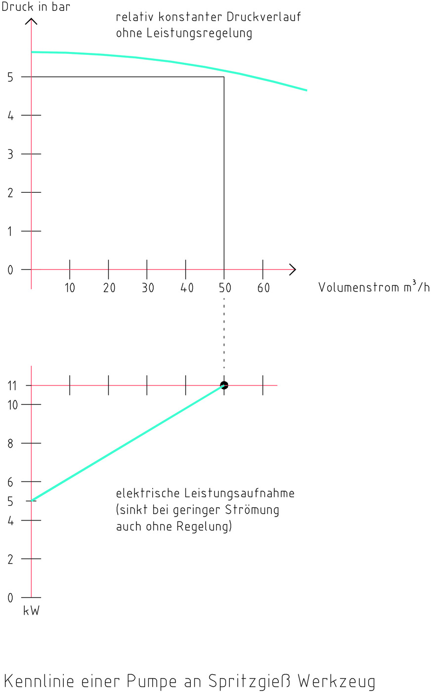 Zu beachten ist, dass die Strömungs-Belastung der Pumpe je nach Auslastung der Produktion unterschiedlich ist, der Druck aber immer gleich hoch am Werkzeug stehen muss – unabhängig von der Auslastung der Produktion, denn sonst ist die erforderliche Strömung im Werkzeug nicht gewährleistet. Also muss der hohe Druck gewährleistet sein, unabhängig davon, ob nur eine Form in Betrieb ist oder alle.