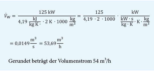 Bei einem Kältebedarf von z. B. 125 kW und der erforderlichen Temperaturdifferenz von 2 K ergibt sich ein Volumenstrom V·W: