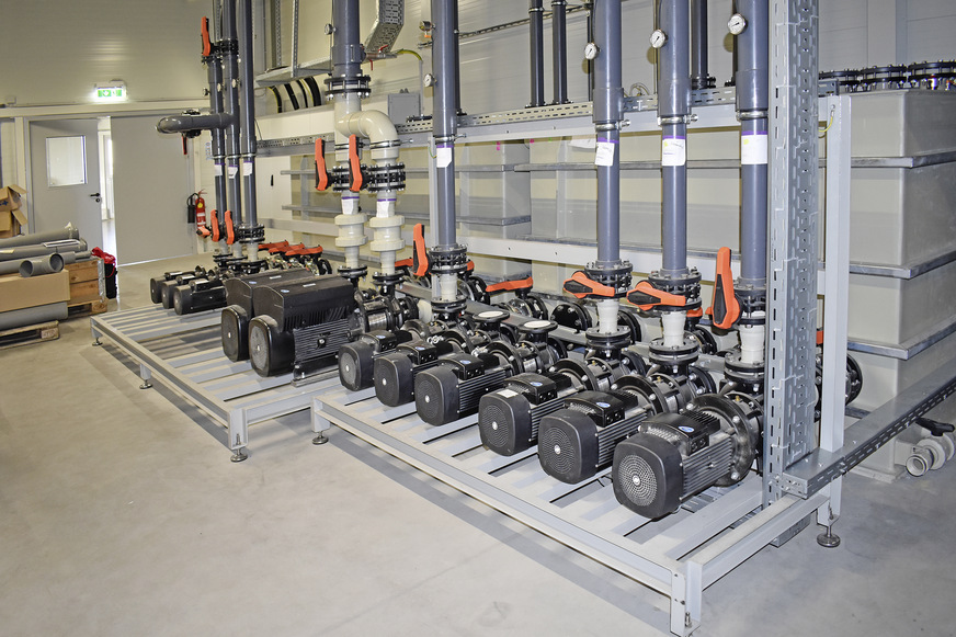 Die Pumpenauswahl erfolgt sinngemäß aus einem Programm eines Pumpenherstellers. Eine Regelung über die Pumpendrehzahl auf die Kühlwasser-Austrittstemperatur ist hier angesagt, denn es wird an den Ölkühlern nicht dauerhaft der hohe Druck benötigt. Durch die Reduzierung der Pumpendrehzahl mittels einer mengenabhängigen Regelung unter Einbeziehung eines Frequenzumrichters kann viel Energie eingespart werden.