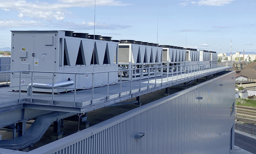 Die Kühlung der Hydraulikkreise erfolgt auf einem Temperaturniveau von +40 °C und wurde durch eine Rückkühlanlage, die aus insgesamt vier V-förmigen Trockenrückkühlern in Edelstahlausführung besteht, realisiert. Zur Kühlung der Schaltanlagen wurde ein zentrales Kaltwassernetz mit einer Vorlauftemperatur von 14 °C installiert. Die Kälteerzeugung wird hierbei von drei luftgekühlten R290-Flüssigkeitskühleren vom Typ Stratos VP8 übernommen. Jeder Kaltwassersatz hat zwei getrennte Kältemittelkreisläufe mit einem stufenlos leistungsgeregelten 8-Zylinder-Hubkolbenverdichter von Bock. Jede Maschine hat eine Kälteleistung von ca. 570 kW, wobei die Kältemittelfüllmenge je Kreislauf lediglich 20 kg beträgt. Zur Optimierung der Gesamtenergieeffizienz ist jeder Kaltwassersatz mit einem externen Freikühlmodul gekoppelt. Die Ansteuerung erfolgt aus dem jeweiligen Kaltwassersatz. Die Freikühlmodule sind so ausgelegt, dass der gesamte Kühlleistungsbedarf bereits bei Außenlufttemperaturen von +7,5 °C abgedeckt werden kann. Die Vorkühlung setzt bereits ab +14 °C automatisch ein. Zur Klimatisierung der Schaltwarten mit einer Vorlauftemperatur von 6 °C wurden in den beiden Seitenschiffen des Gebäudes jeweils ein wassergekühlter R290-Kompakt-Chiller installiert. Jedes Gerät hat eine Kühlleistung von 50 kW und eine Kältemittelfüllmenge von ca. 2 kg, wodurch die Innenaufstellung problemlos zu realisieren war. Die Rückkühlung der Geräte erfolgt über das zentrale Kaltwassernetz mit +16 °C. Ergänzend zu den Kälteerzeugern lieferte Secon auch eine übergeordnete Steuerung auf Basis Siemens S7, welche die luftgekühlten Erzeuger bedarfsgerecht anfordert, die Redundanzschaltung übernimmt und als zentrale Schnittstelle zur GLT von Koehler dient.