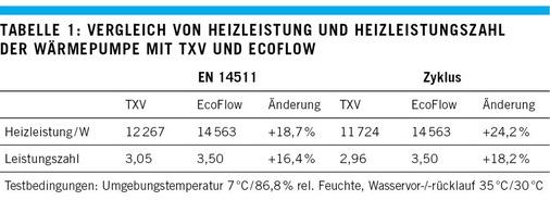 Die ermittelten Werte für die Heizleistung und die Wärmeleistungszahl sind in der Tabelle 1 zusammengefasst. Zum einen erfolgte eine Auswertung gemäß der EN 14511. Dabei wird nur der Zeitraum, der in Bild 3 (links) zwischen den beiden senkrechten gestrichelt dargestellten Linien liegt, ausgewertet. Dadurch bleibt die Abtauphase mit ihrem negativen Beitrag zur mittleren Heizleistung und Leistungszahl unberücksichtigt. Aus Sicht des Anwenders erscheint deshalb eine Auswertung des gesamten Zyklus, von Abtauung bis Abtauung, realistischer. Da mit dem Expansionsmodul keine Abtauphase mehr erforderlich ist, liegen die erzielten Steigerungen der Heizleistung und der Heizleistungszahl hier noch höher.
