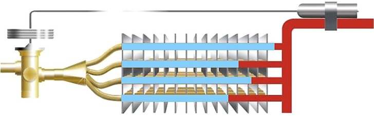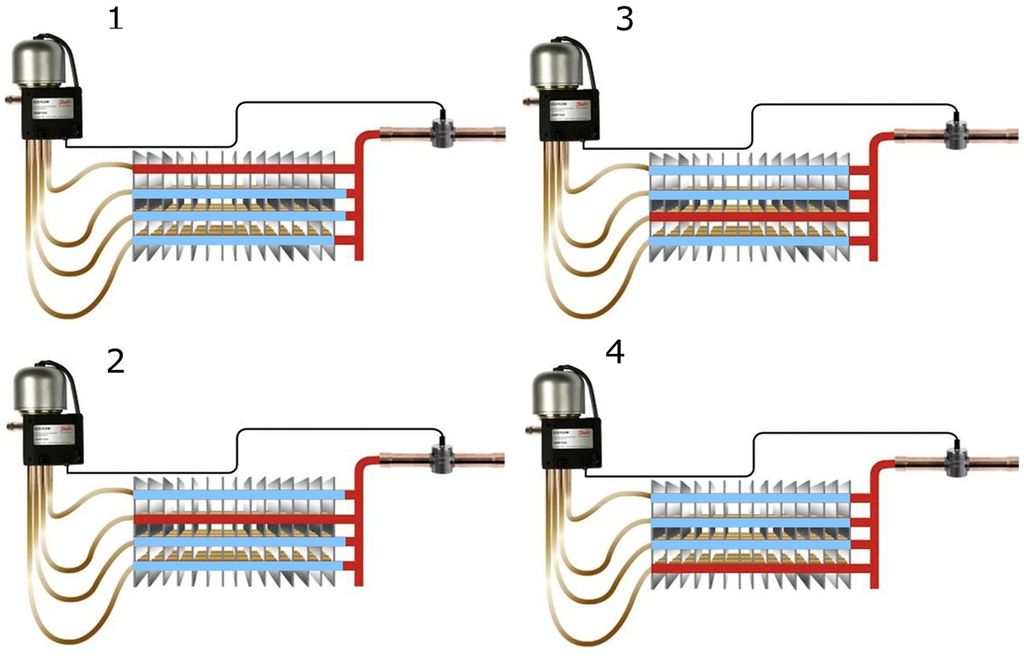 Im Falle einer nicht optimalen Befüllung der Rohrreihen ist die Überhitzungszone jedes Strangs unterschiedlich groß, somit treten auch Unterschiede in den Überhitzungstemperaturen am Austritt der Stränge auf (Bild 1). Der Strang mit der geringsten Überhitzung definiert dabei den Öffnungsgrad des thermostatischen oder elektronischen Expansionsventils. Eine weitere Öffnung des Ventils würde zu Flüssigkeitstropfen in der gemeinsamen Saugleitung führen, die vom Fühler registriert werden würden.