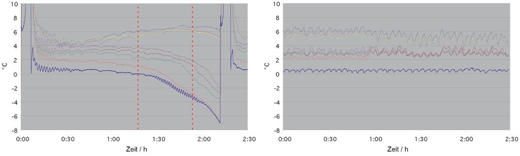 Es erfolgte zunächst eine Messung an dem unveränderten Gerät, ausgestattet mit einem thermostatischen Expansionsventil und einem Kältemittelverteiler. In Bild 3 (links) sind die Temperaturen gemessen an den Ausgängen der acht Verdampferstränge sowie die aus dem Druck berechnete Verdampfungstemperatur dargestellt. Die Verdampfungstemperatur fällt aufgrund der Vereisung zunächst langsam, dann zunehmend stärker ab, bis eine Abtauung eingeleitet wird. Mit zunehmender Vereisung bzw. abfallender Verdampfungstemperatur weicht die Kältemittelverteilung zunehmend von der optimalen ab. Einige Stränge weisen eine relativ hohe Überhitzung auf, während ein anderer Strang quasi keinerlei Überhitzung erzielt.