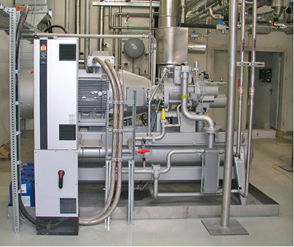 Zur Kälteerzeugung setzte Johnson Controls die fabrikeigenen Sabroe Kolbenverdichter (zwei SMC 104 und ein SMC 108 L) sowie einen Schraubenverdichter, Typ SAB 151 L ein. Diese Verdichter zeichnen sich durch eine hohe Energieeffizienz und eine sichere Leistungsverfügbarkeit bei industrieller Nutzung aus. Die Verdichter wurden weiterhin mit Frequenzumformern ausgestattet, um die Stromersparnis auch im Teillastbereich zu optimieren und eine exakte Leistungsregelung zu ermöglichen. Um die Energiekosten noch weiter zu senken, werden die Ölkühler-Abwärme und die Druckgas-Abwärme zur Erzeugung von Warmwasser (Wärmerückgewinnung) genutzt. Ein weiterer Clou: Die Klimatechnik für das Lagergebäude und die Büros ist mit der Hochdruckseite der Ammoniak-Kälteanlage verbunden. Die NH 3 -/Wasser-Wärmeübertrager liefern kaltes Wasser, das über Pumpen an die Luftkühler verteilt wird. Somit werden zudem die Kosten für die Installation eines zusätzlichen Kaltwassersatzes eingespart.