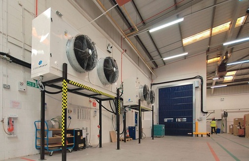 Zugeschnitten auf die spezifischen Anforderungen des Anwenders haben wir in einem Produktionsgebäude einen neuen Kühlbereich geschaffen. Wir haben dazu sechs leistungsfähige Low-Temp-Lüftungsgeräte mit einer Leistung von jeweils 50 kW installiert, so Russell Wilson. Sie werden von vier Kaltwassersätzen des Typs Cool Evo 602 (jeweils 135 kW) mit einer Vorlauftemperatur von 10 °C versorgt und wurden in raumsparenden, für den Lebensmittelbereich konzipierten Schwerlastregalen untergebracht. Diese energieeffiziente Low-Temp-Technik, die wir auf Mietbasis anbieten, ist in besonderem Maße für Chillstores im Lebensmittelbereich geeignet. Sie verfügt über automatische Abtauheizungen, die das Vereisen der Kühlregister verhindern. Temperaturfühler und sowohl optische als auch akustische Warnmeldesysteme garantieren für eine konstante und lückenlose Überwachung. Zusätzlich installierte man unmittelbar neben dem Gebäude zum Be- und Entladen der temperaturkritischen Waren einen Kühlcontainer. Die komplette Maßnahme dauerte, einschließlich Vorkühlung und Inbetriebnahme, zwei Wochen.