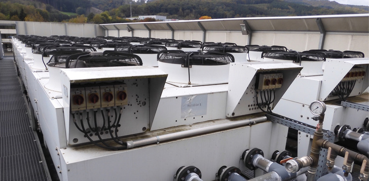 Aufgrund einer unternehmensinternen Produktionsverlagerung stand ein Kühlturm mit Zubehör für die Hydraulikkühlung zur Verfügung, der jetzt mit der modernisierten Kühlstation 3 verbunden wurde. Somit steht in der kühleren Jahreszeit die volle Freikühlerleistung zur Entlastung der drei Kältemaschinen bereit. Im Zuge dieses Umbaus wurde der Kühlturmventilator mit einem drehzahlgeregelten, bedarfsgerecht steuerbaren Antrieb ausgerüstet. Das spart Energie im Betrieb und amortisiert sich innerhalb eines überschaubaren Zeitrahmens. Auch die Wärmetauscher konnten auf diese Weise wiederverwendet werden.
