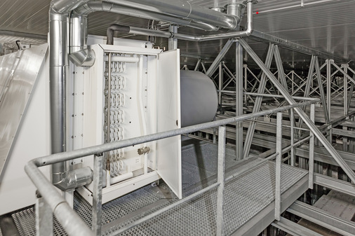 Die neun Güntner Highstore Application Luftkühler im Tiefkühl-Lagerraum haben eine Leistung von jeweils 100 kW. Sie stehen in 36 m Höhe oberhalb der Regaloberkanten auf einer längsseitig durchgehenden und begehbaren Bühne. Der Sauerstoffgehalt im Lager wird aus Brandschutzgründen reduziert und beträgt hier oben nur 13 Prozent. Wartungsarbeiten werden daher unter besonderen Sicherheitsvorkehrungen durchgeführt. Es müssen immer mindestens zwei Personen anwesend sein und die Arbeiten im Lager müssen nach 30 Minuten unterbrochen werden. Standardmäßig ist über eine Wartungstür ein guter Zugang für Wartungsarbeiten von beiden Seiten des Luftkühlers gewährleistet.