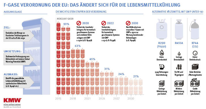 Ziel der EU-Verordnung ist die schrittweise Reduktion der in der EU in Verkehr gebrachten fluorierten Treibhausgasmengen bis zum Jahr 2030 um 79 Prozent, auch Phase-Down genannt. Hier lautet der Schlüsselbegriff Global Warming Potential (GWP): Er bezeichnet das Treibhauspotenzial,das von den in den Kühl- und Tiefkühlmöbeln eingesetzten Kältemitteln ausgeht.
