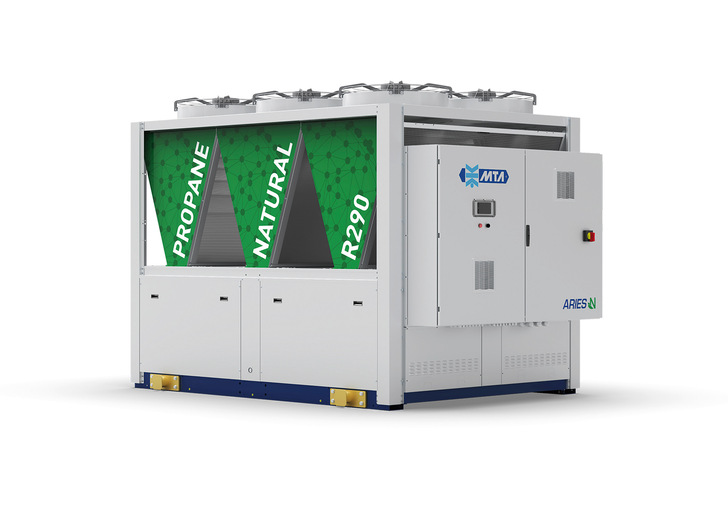 Die Kältemaschinen der Aries-Baureihe sind auch mit R 290 als Kältemittel verfügbar. Aries N Kaltwassersätze sind im Standard mit zwei Kolbenkompressoren in zwei unabhängigen Kältekreisen ausgestattet. die iAries als Inverter-Version arbeitet in der 1+I - Konfiguration. Dazu gibt es elektronische Expansionsventile, eine Kurbelwannenheizung, Phasenüberwachung und Microchannel-Verflüssiger. Aktuell kann der Anwender zwischen vier Leistungsgrößen von 177 bis 472 kW wählen. Für Kaltwasser Klimasysteme in geräuschsensibler Umgebung sind Optionen mit Schallschutzhauben für die Verdichter, Schallschutz-Einhausung der Kompressoren und EC-Ventilatoren erhältlich. Die SHE-Version ist so bis zu 5 dB(A) leiser. Bei besonderen Anforderungen für Kühlwasser in der Produktion sind Konfigurationen für niedrige Wasseraustrittstemperaturen bis -10 °C, interne Wasser-Speichertanks und Einzel- oder Doppel-Pumpen bestellbar.
