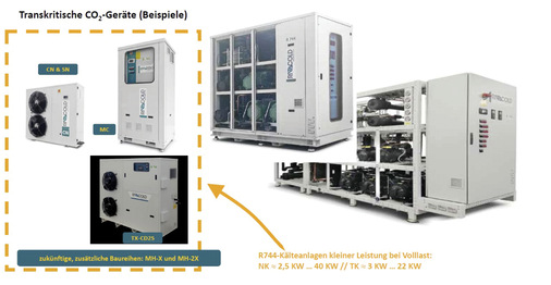Gewerbekälteanlagen mit R744 im mittleren und größeren Leistungsbereich, wie zum Beispiel bei zentralen Verdichter-Verbundkälteanlagen mit Kälteleistungen von