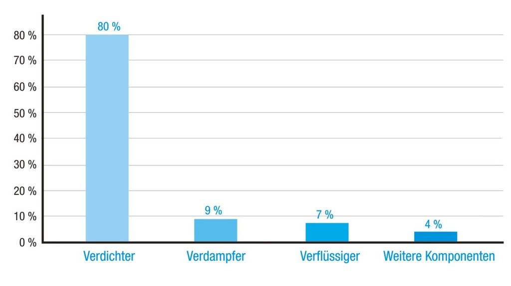 Der Grund für die Effizienzsteigerung durch den Einsatz von Frequenzumformern ist, dass der größte Energieverbrauch einer kompletten Kälteanlage mit 60 bis zu über 80 % dem Bereich der Verdichter zugeordnet werden kann (siehe Bild 1). Daraus ergibt sich naturgemäß, dass in diesem Bereich auch ein großes Einsparpotenzial hinsichtlich der Energiekosten steckt.