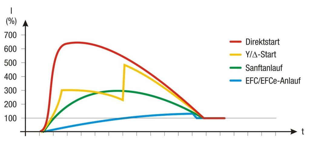 Ein weiterer Grund zur Energieeinsparung mit Frequenzumformer ist die zu jedem Zeitpunkt optimale Ausnutzung des Verdichtermotors. Dies führt zur Reduzierung des Anlaufstromes und mindert auch die Schalthäufigkeit des Verdichters. Ein Verdichter mit Frequenzumformer hat deshalb in der Regel eine längere Lebenserwartung als ein Verdichter ohne Frequenzumformer (siehe Bild 4).