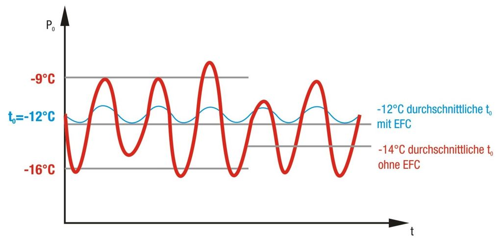 Da die Verdampfungstemperatur mit Frequenzumformer, wie dem EFC-System, zu jedem Zeitpunkt mit äußerst geringen Temperaturschwankungen sehr konstant gehalten werden kann, ändert sich die Kühlraumtemperatur im Gegensatz zum Ein/Aus- bzw. Taktbetrieb nicht. Dies wirkt sich positiv auf die Qualität von empfindlicher Kühlware wie Fleisch, Gemüse und Obst aus. Dadurch wird z.B. diesem Kühlgut kein Wasser entzogen Wasserverlust bedeutet Qualitäts- und Gewichtsminderung, was aus ökonomischer Sicht für den Anlagenbetreiber zu Verlusten führen kann.
