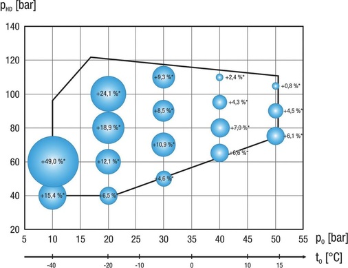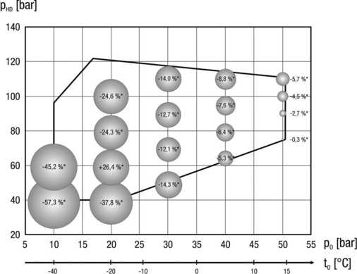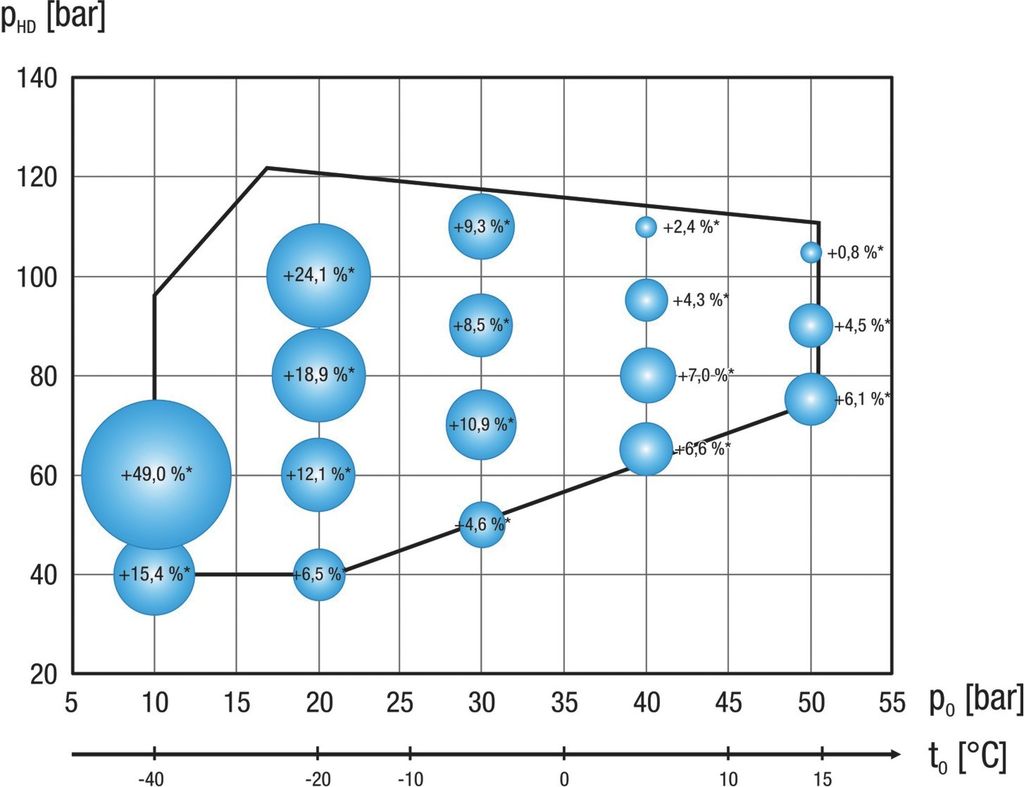 Eine Erhöhung des COP im gesamten Einsatzgrenzendiagramm wird mit luftgekühlten transkritischen CO 2 -Verdichtern im Vergleich zu sauggasgekühlten CO 2 -Verdichtern erreicht (siehe Bild 4). Lediglich eine geringe Reduzierung der Wärmeleistung am Gaskühler bei der Wärmerückgewinnung muss in Kauf genommen werden. Bei luftgekühlten transkritischen CO 2 -Verdichtern kann ein Hochdruck von 110 bar auch bei hohen Verdampfungstemperaturen erreicht werden. Dies ermöglicht den Betrieb des Verdichters unter idealem Hochdruck, mit maximal möglichem COP bei hohen Verdampfungstemperaturen und hohen Gaskühleraustrittstemperaturen.