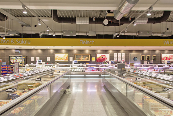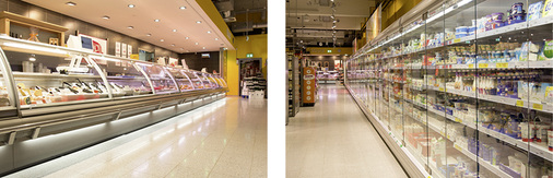 Die Normalkühlung der insgesamt73,2 m2 großen Displayfläche für Käse-, Wurst- und Milchprodukte übernimmt ebenfalls das Conveni-Pack. Die Normalkühlung besteht aus 22,5-m-Wandregal, 17,3-m-Bedientheke und vier Kühlräumen, die als Lager dienen.