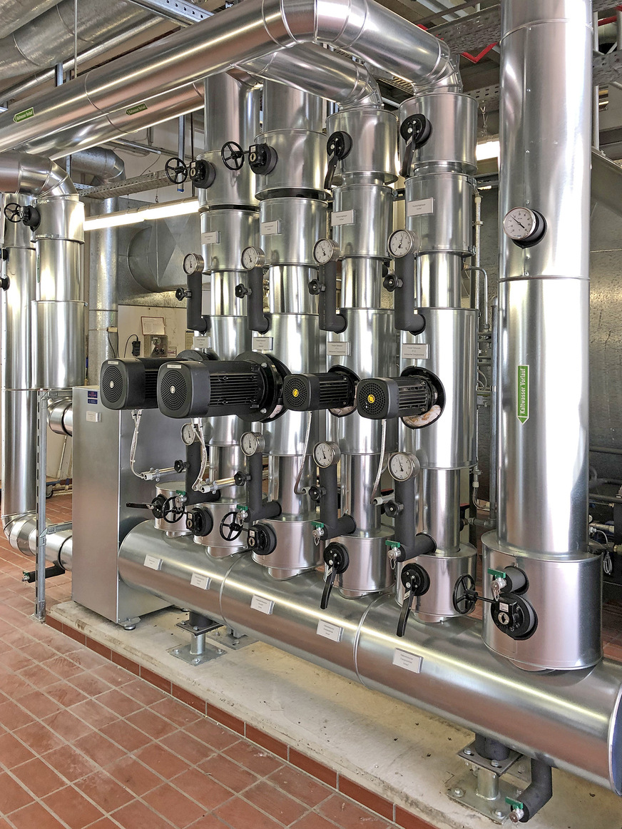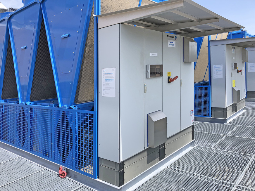 Die vor ca. 25 Jahren installierte Kälteanlage war mittlerweile veraltet und immer näher an ihre Kapazitätsgrenze gekommen und auch hier eine Modernisierung daher notwendig. Auch dieser Umbau war ein komplexes Projekt. Allein die für die Kälteanlage zu installierende Automatisierungstechnik verteilte sich über mehrere Stockwerke der Energiezentrale. Zusammen mit einem Fachplaner für Kältetechnik entschied Schwabe die zwei vorhandenen Absorber-Kältemaschinen, die bislang im Gebäude montiert waren, durch vier Kompressor-Kältemaschinen auf dem Dach zu ersetzen.
