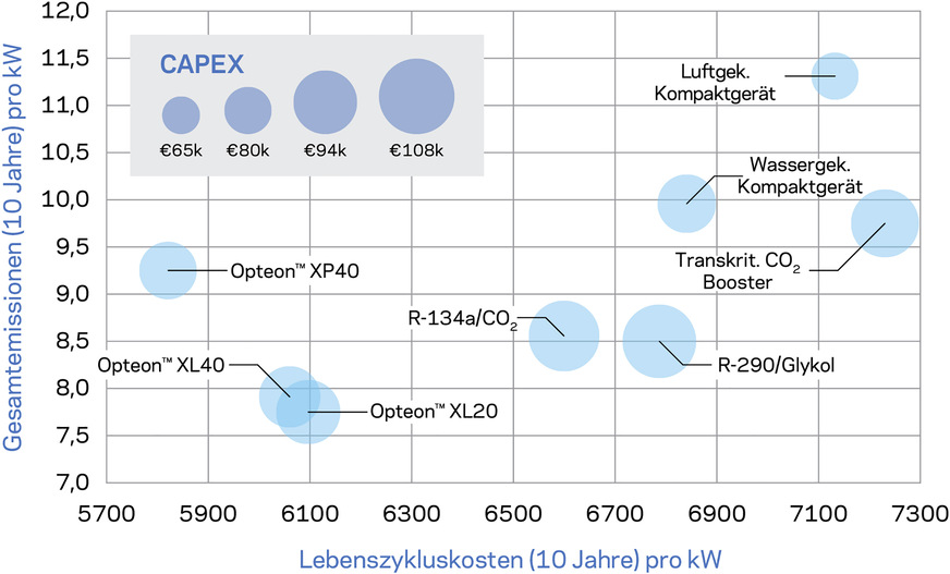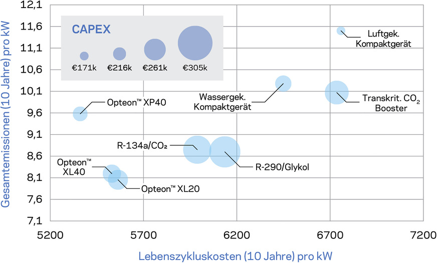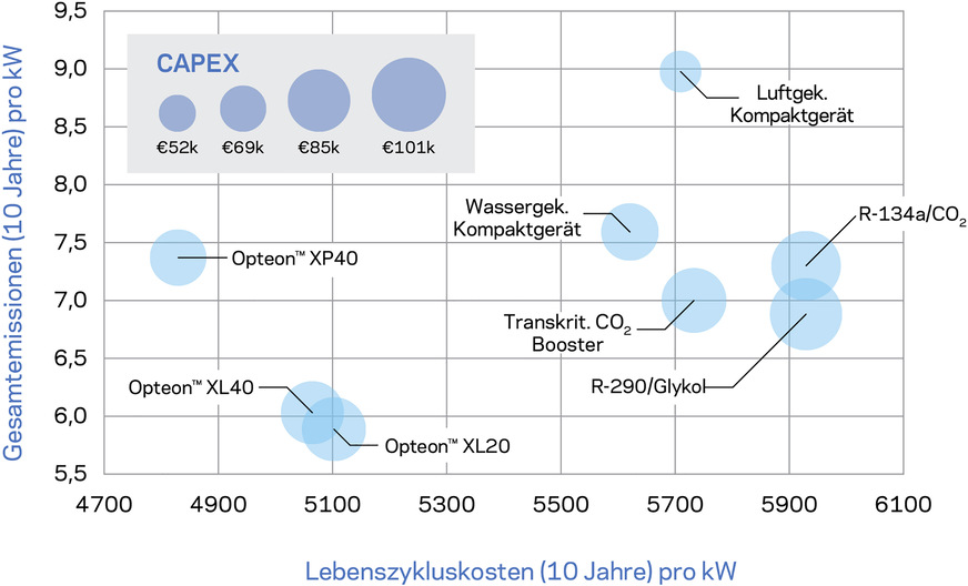 Vergleicht man die gesamten, über zehn Jahre kumulierten Emissionen pro kW Kälteleistung mit den über zehn Jahre kumulierten Lebenszykluskosten pro kW Kälteleistung, so wird deutlich, welche Technologien die niedrigsten Treibhausgasemissionen bei niedrigsten Lebenszykluskosten ermöglichen. Für einige Betreiber können die Investitionskosten ein wichtiges Entscheidungskriterium sein (obwohl diese in den über zehn Jahre kumulierten Lebenszykluskosten enthalten sind). Daher gibt die Größe der Blasen in den folgenden Diagrammen die Höhe der Investitionskosten (CAPEX) für jede Technologie an, d. h. je kleiner die Blase, desto geringer die Investitionskosten.
