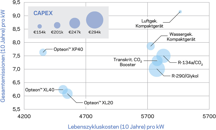 Die Studie untersuchte die Kosten (Investitionskosten – CAPEX und Betriebskosten – OPEX), Gesamtemissionen (TCO₂e) für jedes Szenario und verglich die Ergebnisse mit der zugrunde gelegten Opteon™-XP40-Technologie, um Endanwendern eine solide Basis zur Verfügung zu stellen, um zu entscheiden, welche Technologie die beste Wahl für die Zukunft ist.