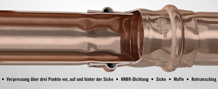 >B< MaxiPro Fittings werden aus sauerstofffreiem Kupfer gefertigt und eignen sich für die Verbindung von Kupferrohren in zölligen Abmessungen nach DIN EN 12735-1 oder ASTM B280. Sie halten dauerhaft hohen Betriebsdrücken von bis zu 48 bar stand und widerstehen im Rahmen der Prüfungen auch Spitzen von mehr als dem dreifachen Betriebsdruck.