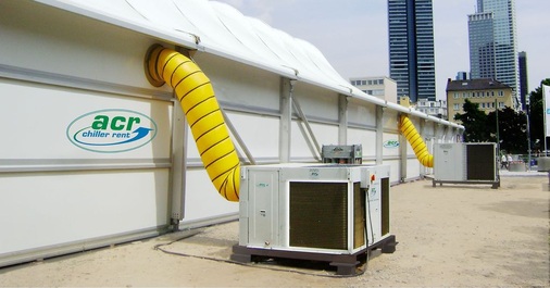 Da die Rooftopeinheiten bis zu 300 Pa externe Ventilatorpressung bringen, sind weitverzweigte Luftschlauchleitungen bis 50 m möglich und damit eine bessere Luftverteilung. Insgesamt wurden fünf Rooftopeinheiten montiert. So konnten die Mietkältespezialisten die Vorgaben der Zonenregelung und der Redundanz erfüllen. Um bei hohen Feuchtelasten eine Entfeuchtung im Zelt zu ermöglichen, wurde zusätzlich eine Luft/Wasser-Wärmepumpe mit einem Klimaschrank zur Innenaufstellung installiert. Im Heizbetrieb wird hier 100 % Umluft gefahren, was hohe Ausblastemperaturen zur Folge hat.