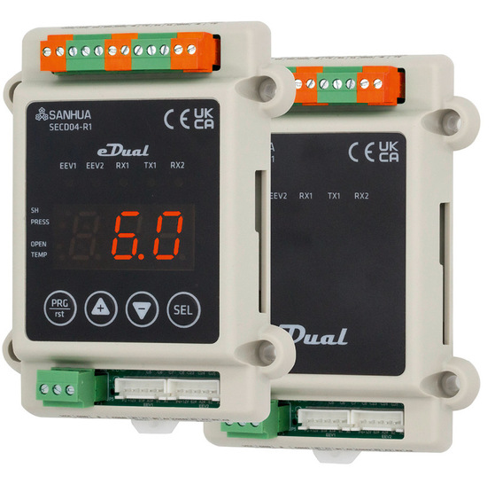 Sanhua bietet mit der Serie Secd 04, auch eDual genannt, einen Regler zur Ansteuerung von zwei elektronischen Expansionsventilen (EEV) und zur Regelung der Überhitzung mittels PID-Algorithmus. Das Gerät verarbeitet die Signale eines Drucksensors für beide Kreisläufe sowie von zwei Temperatursensoren. Zwei digitale Eingänge können als unabhängige Start/Stopp-Signale oder als kombiniertes Start/Stopp- und Abtausignal konfiguriert werden. Die Ansteuerung der Ventile erfolgt über einen 12 Vdc Rechteckwellen-Ausgang. Über eine RS 485-Schnittstelle mit Modbus-Protokoll lassen sich bis zu 32 Regler, bestehend aus einem Master und 31 Slaves, kaskadieren. Dabei können die Slave-Geräte die Signale für Druck, Betrieb und Abtauung vom Master-Gerät gemeinsam nutzen. Die Serie ist mit den Sanhua-Ventilen der Typen LPF-T, DPF und EBV kompatibel und für eine Vielzahl an Kältemitteln ausgelegt.