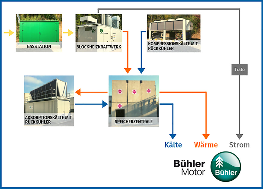 Im nächsten Schritt wurden anhand von Wirtschaftlichkeitssimulationen die enormen Energie-Einsparungen mit einem KWKK-System unter Einsatz von Adsorptionskältemaschinen gegenüber der aktuellen Energieversorgung ermittelt. „Das Entscheidende dabei war, ein Ergebnis zu erhalten, welches die Betriebskosten trotz des Standortausbaus reduziert. Mit unserer Energielösung spart Bühler Motor jährlich 210 000 Euro Betriebskosten ein und erzielt einen ROI von etwa 3,5 Jahren bezogen auf das KWKK-System als Containerlösung“, so Stahl. Insgesamt reduziert das KWKK-System die Energiekosten um jährlich 33 Prozent für den gesamten Standort. Hinzu kam der Antrag auf Förderung an das Bundesamt für Wirtschaft und Ausfuhrkontrolle (BAFA) bei einer Anschaffung von Sorptionstechnologie mit Kälteleistungen zwischen 5 und 600 kW, der eine hohe Fördersumme versprach. Angesichts dieser positiven Resultate stellte sich die Kraft-Wärme-Kälte-Kopplung für das Unternehmen als attraktivste Lösung heraus. „Wir haben uns letztendlich von der konventionellen Kühlung abgewandt und uns erneut für Adsorptionskältetechnik und ein BHKW von InvenSor entschieden. Die daraus resultierenden Einsparungen an Energie und Betriebskosten sind unseren Anforderungen vollends gerecht geworden und haben das Vertrauen in dieses Unternehmen weiter gestärkt“, begründet Horning die Entscheidung von Bühler Motor. Daraufhin wurde Ende 2017 ein Projektierungsauftrag mit InvenSor ausgelöst, der tiefergehende technische Bestandsaufnahmen und Vorplanungen zur neuen Energiezentrale beinhaltete. Darauf aufbauend kamen weitere Komponenten zur Vervollständigung dieses Systems hinzu, wie etwa eine Speicherzentrale, neue Versorgungsstraßen und eine Kompressionskältemaschine (KKM).