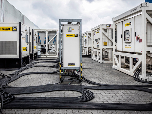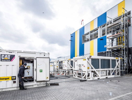 Energyst stellte innerhalb des vorgegebenen Zeitraums die drei Stromerzeuger, die beiden Stromverteiler, einen Dieseltank und die sieben Kaltwassersätze auf und verlegte rund 800 m Wasserschlauch und 720 m 240-mm2-Einzeladerkabel. Um die Wasserschläuche mit ihrem Durchmesser von 100 mm von der ebenerdigen, temporären Anlage zur bestehenden Kühlung im Dachgeschoss führen zu können, nahm Energyst dann die Unterstützung von Zeppelin Rental in Anspruch. Die Mietstation Glinde lieferte mit kurzer Vorlaufzeit einen Teleskopstapler, mit dem Schläuche und Boxen gehoben werden konnten.