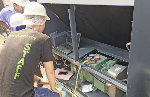Vor dem Kühlraum von Pyramid Wilmar in Colombo reiht sich Karton an Karton. In ihnen sind die insgesamt zehn Ecostar Verflüssigungssätze von Bitzer angeliefert worden. Einen Karton haben die Techniker der Iceman Group of Companies inzwischen zerschnitten und verwenden ihn als Sonnenschutz. Bei stahlblauem Himmel und einer Außentemperatur von fast 35 °C ist jedes Schattenplätzchen willkommen. Kwan Chee Wei, General Manager von Bitzer South East Asia, und Jan Grübel, Head of Commercial Refrigeration bei Bitzer in Sindelfingen, arbeiten mit den Technikern der Iceman Group of Companies an der Inbetriebnahme von fünf Ecostar. Seit 2009 haben wir bereits über 200 unserer Ecostar in Sri Lanka installiert. Aber das ist das erste Projekt mit den Ecostar LHV7E Verflüssigungssätzen der neuesten Generation, installiert in einem Master-Slave-System“, sagt Kwan Chee Wei. Unsere Aufgabe ist es, eine zuverlässige und ausfallsichere Kältetechnik zu installieren. Da der langjährige Händler Iceman bereits viel Erfahrung mit Kühlräumen hat, hat man auch für so einen großen Kühlraum wieder auf Ecostar Qualität von Bitzer zurückgegriffen.“ Die insgesamt zehn Ecostar werden zur Kühlung von zwei Räumen eingesetzt, pro Kühlraum sind je fünf Verflüssigungssätze installiert. Vier Ecostar sind in einem Master-Slave-System installiert, ein Ecostar fungiert als Stand-by-Unit. Betrieben werden die Ecoline Varispeed Hubkolbenverdichter mit dem Kältemittel R134a.