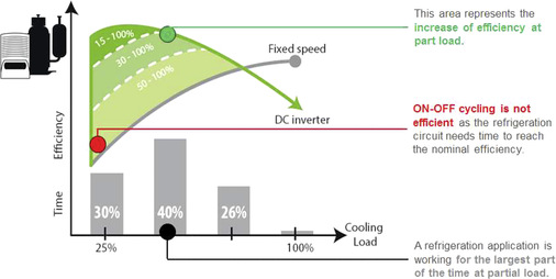 Die DC-Technologie bietet einem Kühlsystem die Möglichkeit, die Kühlleistung entsprechend der tatsächlichen Lastanforderung zu modulieren. Permanentmagnetverdichter mit variabler Drehzahl und intelligenten DC-Antrieben ermöglichen einen hohen Wirkungsgrad unter allen Lastbedingungen. Eine Kälteanwendung arbeitet den größten Teil der Zeit bei Teillast. Und genau in diesem Bereich arbeitet die DC-Technik am effizientesten. Das Effizienzsteigerungspotenzial wird über die größte Betriebszeit (Teillastbetrieb) abgerufen. Dagegen haben Systeme, welche noch im ON/OFF-Betrieb betrieben werden, ihren größten Wirkungsgrad nur im Vollastbetrieb, welcher nur selten vorkommt. Der EIN-AUS-Zyklus ist auch deshalb nicht effizient, da der Kältekreislauf Zeit benötigt, um den Nennwirkungsgrad zu erreichen, was bei DC-Betrieb nicht der Fall ist.