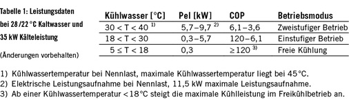 Energetisch sinnvolle Kaltwassertemperaturen beginnen bei ca. 22 /16 °C. Systembedingt möglich und besonders wirtschaftlich sind Kaltwassertemperaturen von 28 /22 °C und höher, die herkömmliche Kältemaschinen in der Regel nicht bedienen können. Die Maschine erreicht dann eine Kälteleistung von 35 kW.